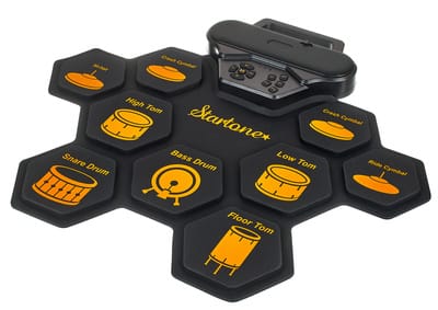 Le Startone Mat Drum est une batterie de table mobile avec des surfaces hexagonales pour divers éléments. Elle propose 3 sons de batterie, 9 chansons de démonstration et 10 rythmes. Équipée d’une sortie casque, d’un haut-parleur intégré et d’une batterie lithium-ion, elle inclut également une pédale de grosse caisse, une pédale de charleston et des baguettes. Dimensions : 493 x 430 mm, poids : 745 g